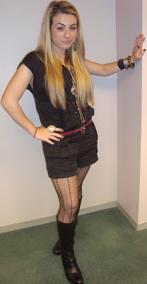 On Nikki: Silk Jumpsuit by Plastic Island, found at Macy's. Jewelry from Forever 21 and Vintage. Boots are Franco Sarto and tights from Forever 21. Belt was grandmother's. For an Extra Twist, Sweater is from Old Navy.